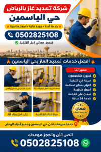 إذا كنت تبحث عن شركة تمديد غاز بالرياض حي الياسمين تقدم لك خدمات احترافية وآمنة بأسعار مناسبة، فأنت وصلت إلى الجهة المناسبة. نحن نوفر جميع أعمال تمديد الغاز للمنازل والفلل والمطاعم والاستراحات بأعلى معايير الجودة والأمان، مع فريق عمل متخصص وخبرة طويلة في تنفيذ جميع أنواع الشبكات الداخلية والخارجية. اتصل الآن على 0502825108 واحصل على أفضل خدمة في أسرع وقت.